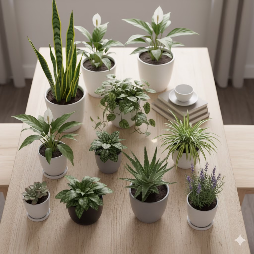 • Bedroom: Snake Plant, Peace Lily, Lavender for better air and sleep.