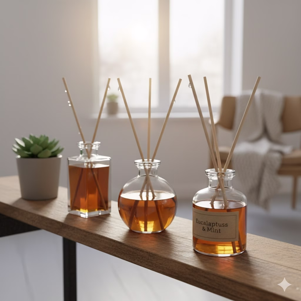 A store-bought reed diffuser uses a scented oil base and bamboo sticks (reeds). The reeds pull the scent up and let it out into the air. Making your own lets you control the items and avoid fake perfumes.