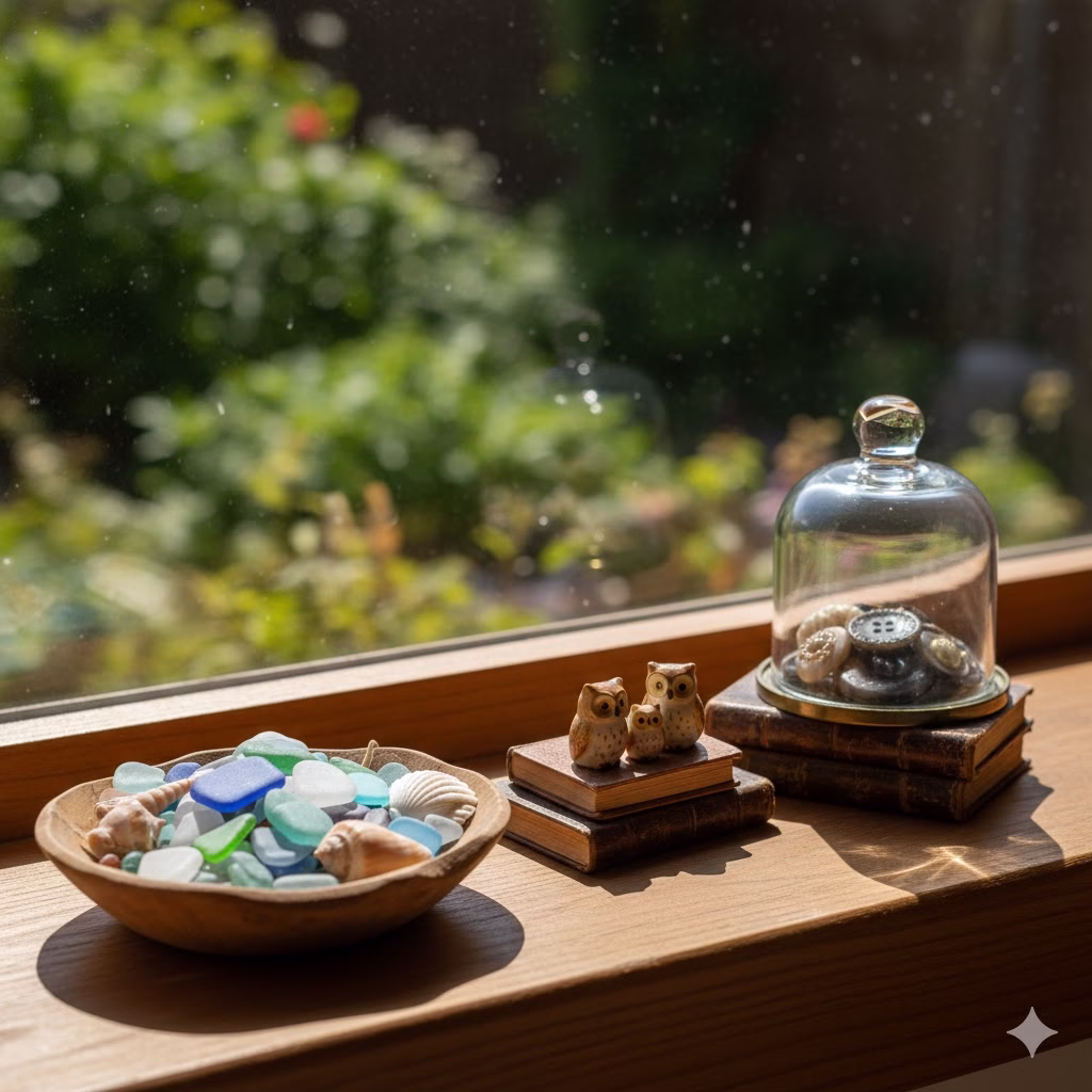 - The Glass Advantage: Glass collections (like antique inkwells, marbles, or small paperweights) look amazing on a window sill. The light shines through them, revealing their color and shape in a way that would be impossible in a darker spot.