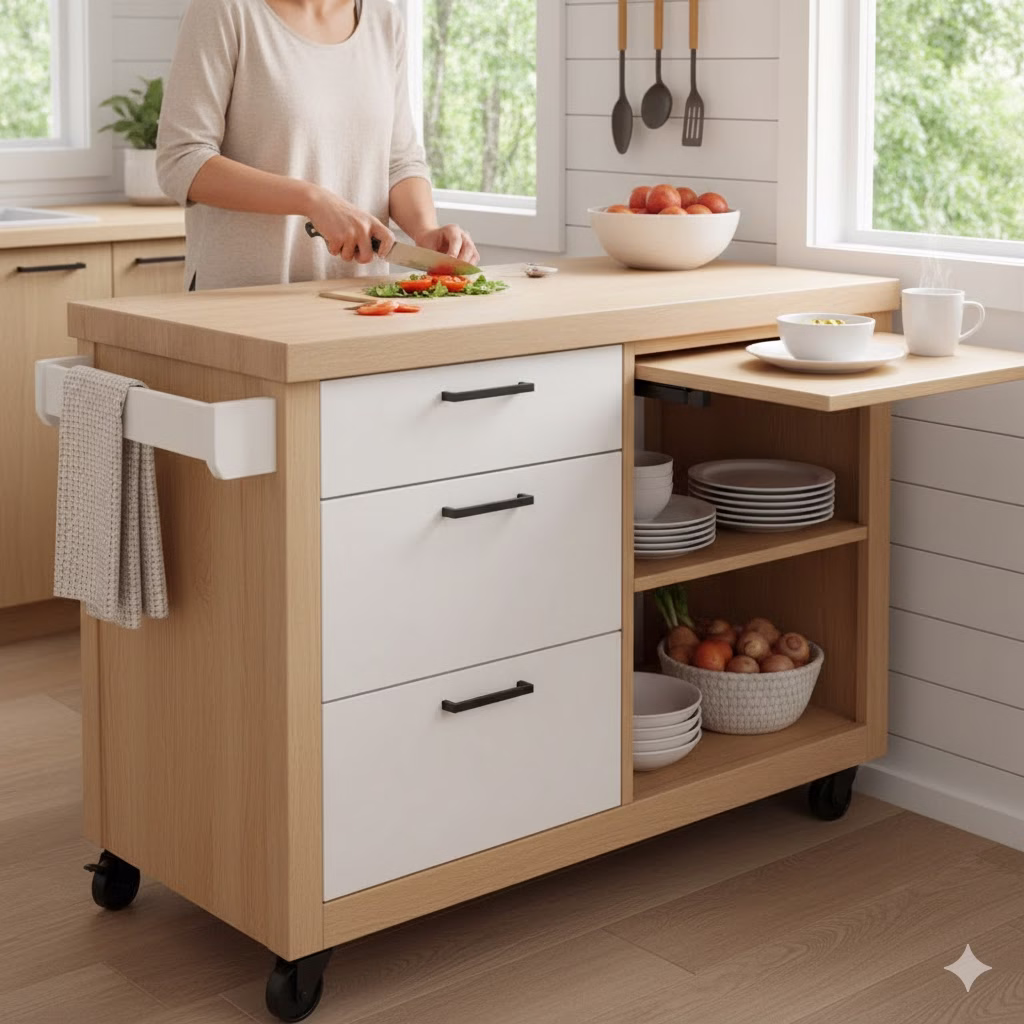 - How to do it: Find carts with strong, lockable wheels. Think about one with drawers or shelves for best storage. A solid top (like butcher block) makes it more useful.