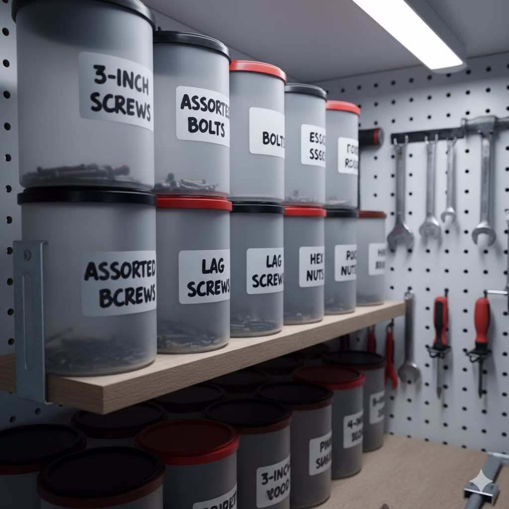 - Label: Use paint, a strong marker, or a printed label to clearly show what is inside (for example, “Long wood screws,” “Mixed Bolts,” etc.).