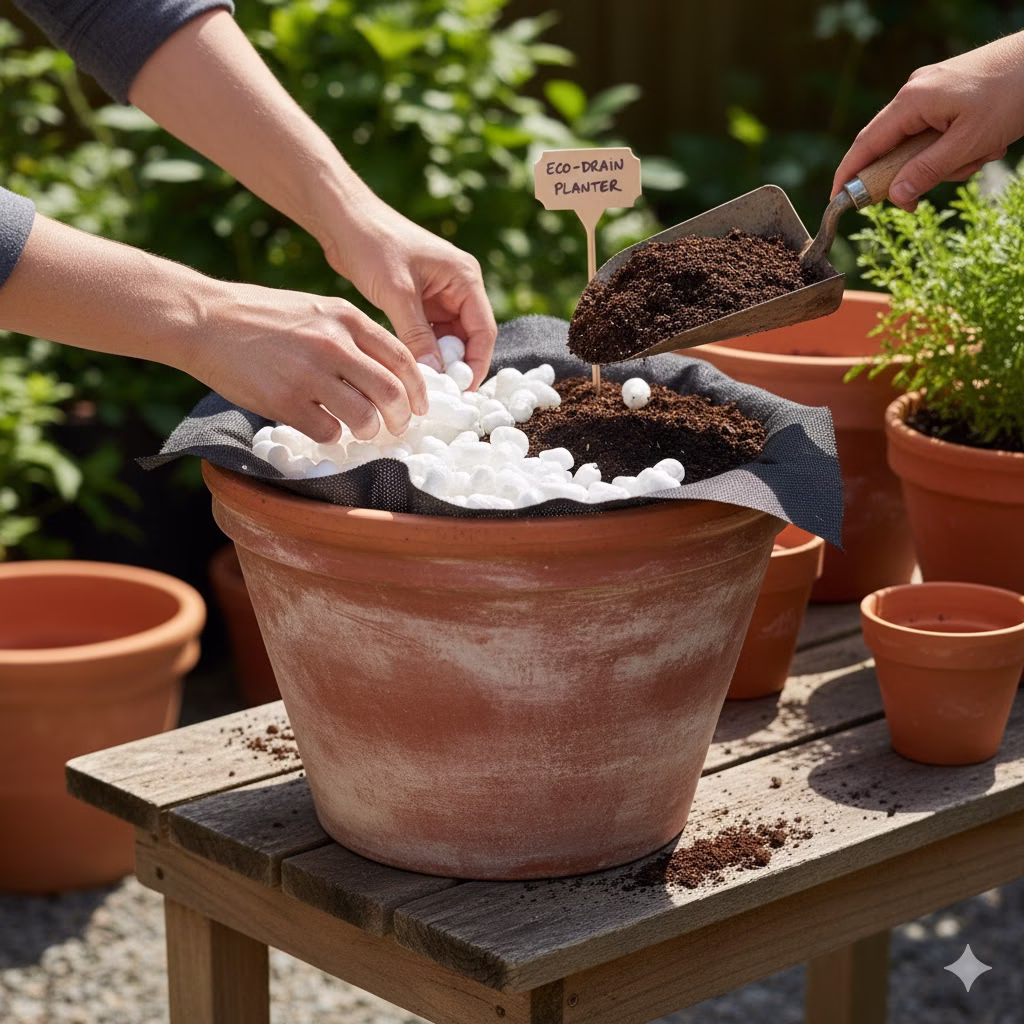 - Fill the Bottom: Put a layer of clean, traditional Styrofoam packing peanuts in the bottom third of the big plant pot. This takes up space. It greatly lowers how much heavy soil you need.