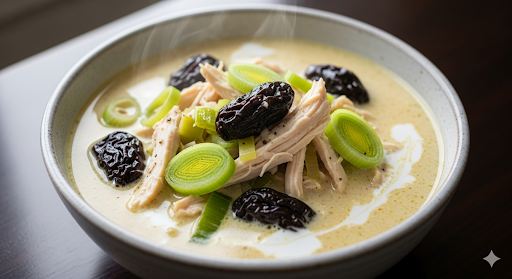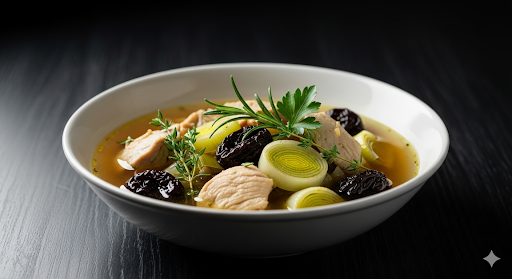 The beauty of this soup lies in its elegant simplicity. It’s a perfect harmony of flavors: the savory, tender chicken, the mild, sweet notes of the leeks, and the unexpected but delightful hint of sweetness from the prunes. This combination creates a complex and deeply satisfying flavor profile that is both rustic and refined. The prunes are the secret ingredient that sets this soup apart, adding a unique fruity undertone that balances the savory elements and makes the dish truly unforgettable.