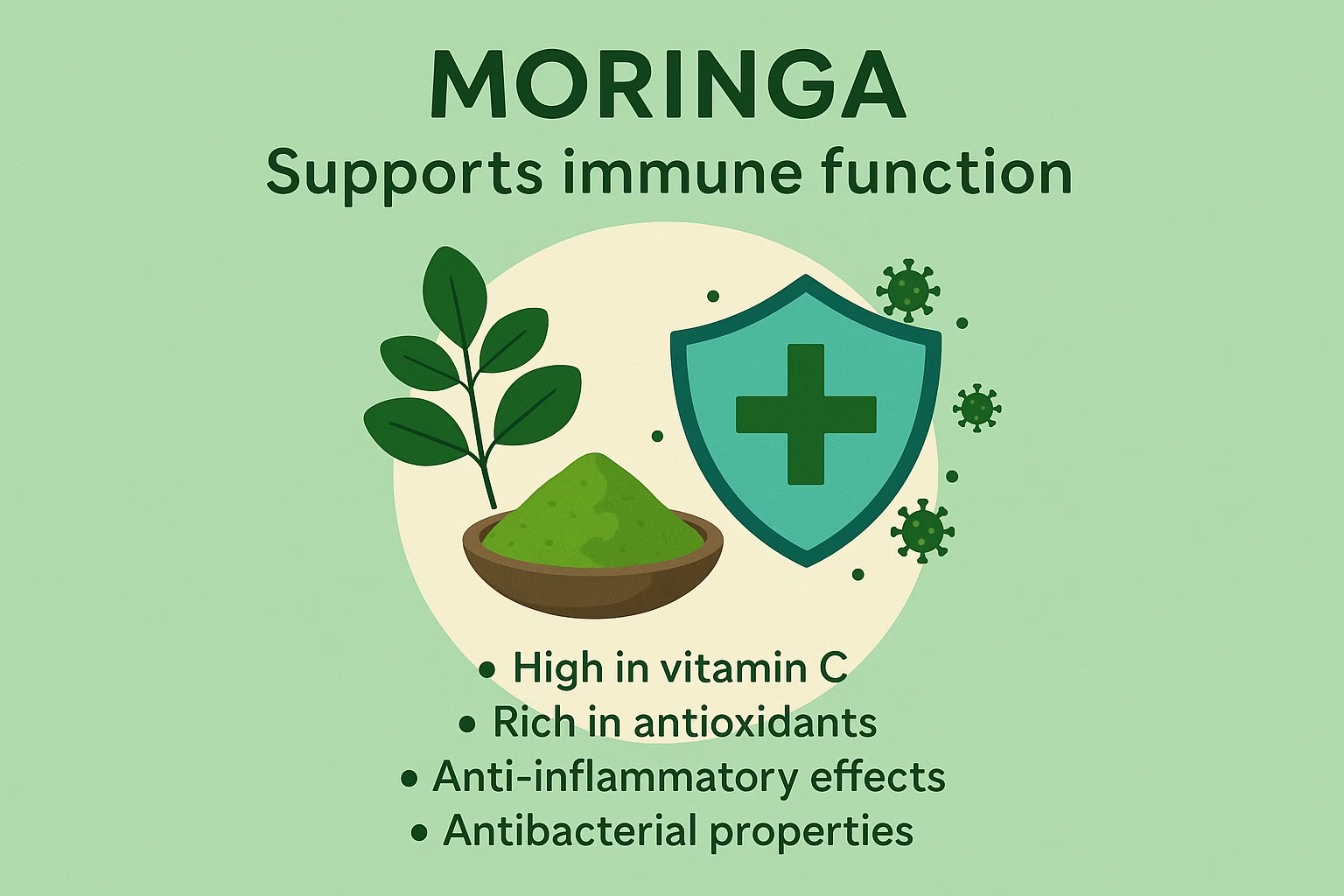 - Strengthens Immunity: With its high levels of Vitamin C and other helpful compounds, moringa helps make your body’s defense system stronger, helping you fight off sickness.