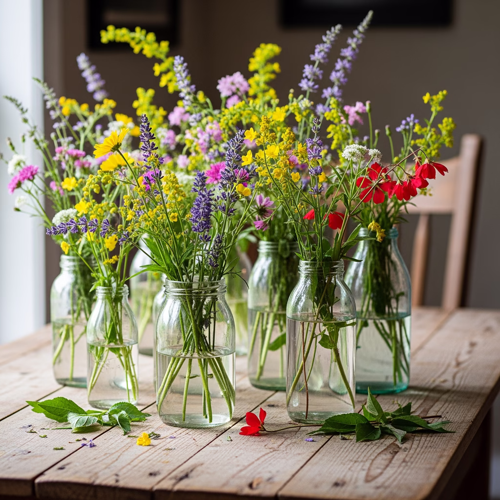 Start by painting the glass. Brush the jars with soft blue or cream paint. If there are streaks, that is fine. It looks good that way. Once the paint is dry, use the sandpaper. Rub the corners to show the glass underneath. This gives it a worn look. Then, put your flowers in. Trim the stems so they fit the height of the jar. Mix different types of flowers together. For a style tip, put three jars in a group. This makes a great center piece for a table.