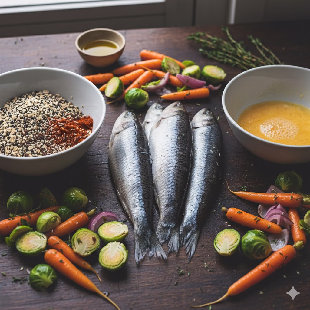 - Prep the Vegetables: Preheat your oven to 400∘F (200∘C) for the vegetables, or ensure your air fryer has enough space to cook them alongside the fish (you may need to cook in batches). In a mixing bowl, toss the Brussels sprouts, baby carrots, and red onion chunks with 2 teaspoons of olive oil, dried thyme, salt, and pepper. Set aside.