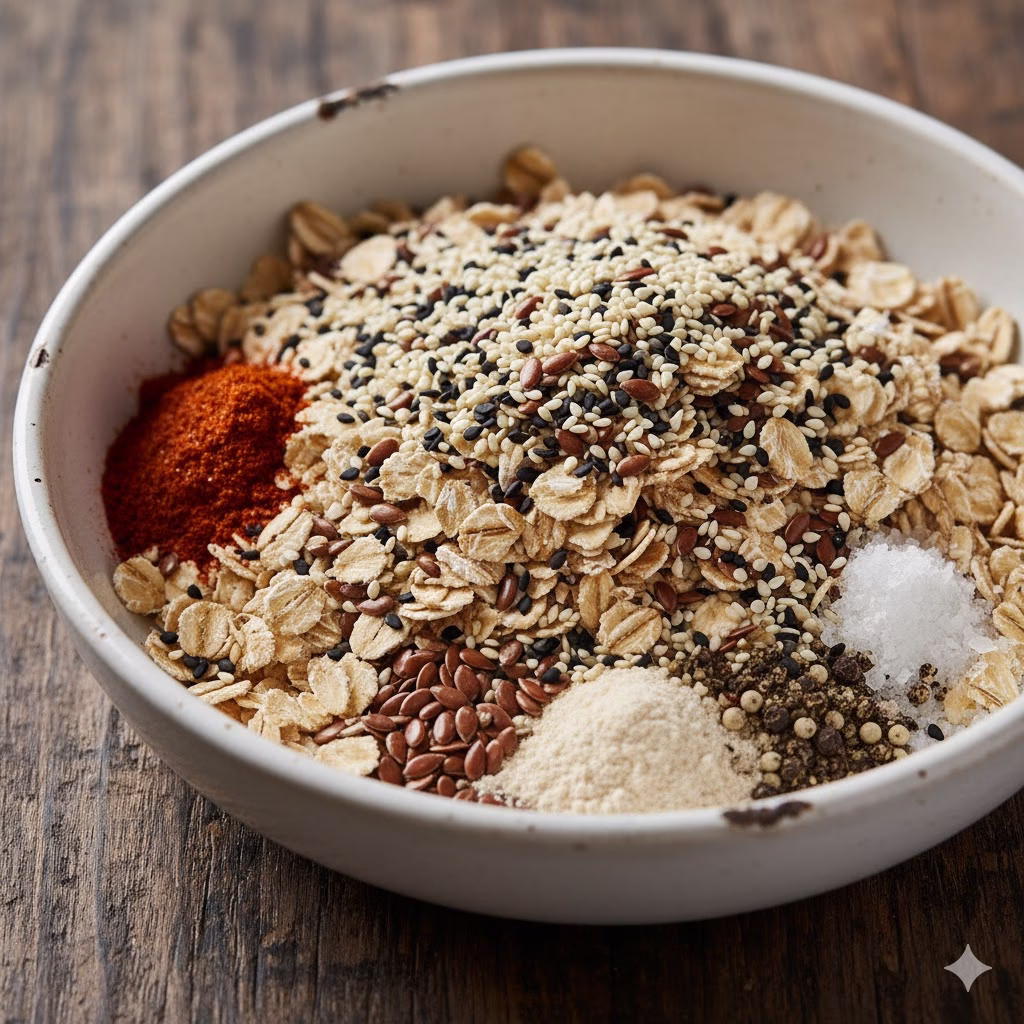- Make the Coating: In a shallow dish or plate, combine the pulsed rolled oats, sesame seeds, flaxseeds, smoked paprika, garlic powder, 21 teaspoon sea salt, and black pepper. Stir them well until they are evenly mixed. This is your dry coating.