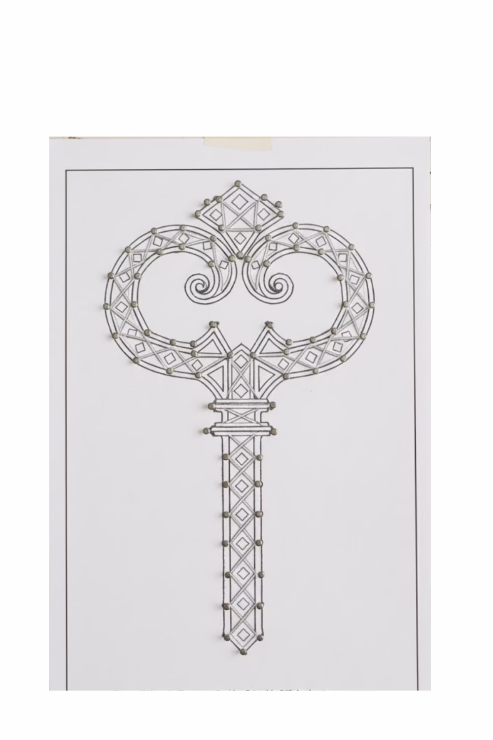 The most important part of this design is reproducing the look of an antique skeleton key. This type of key has a decorative bow (the top loop) and an intricate bit (the notched end). This project relies on a detailed silhouette, unlike simple geometric string art.