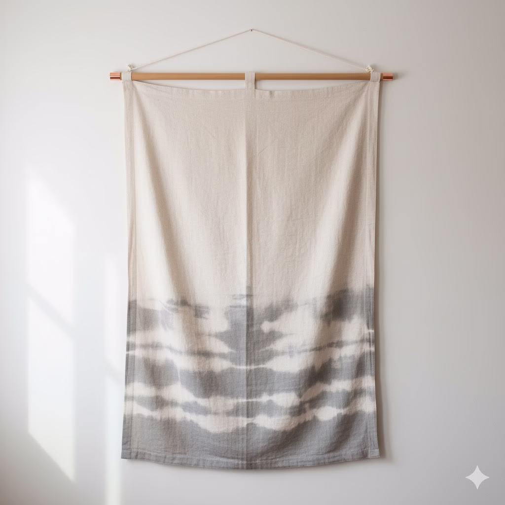 A subtle pattern improves the look. This step is optional. The Japanese shibori method (a type of tie-dye) works very well. Scrunch or fold a section of the fabric. Secure it tightly using rubber bands. Dip only the bottom half of the fabric into a bucket of diluted fabric dye. When the fabric dries and you remove the ties, you will see soft, organic patterns. This makes the Art at Home piece look high-concept.