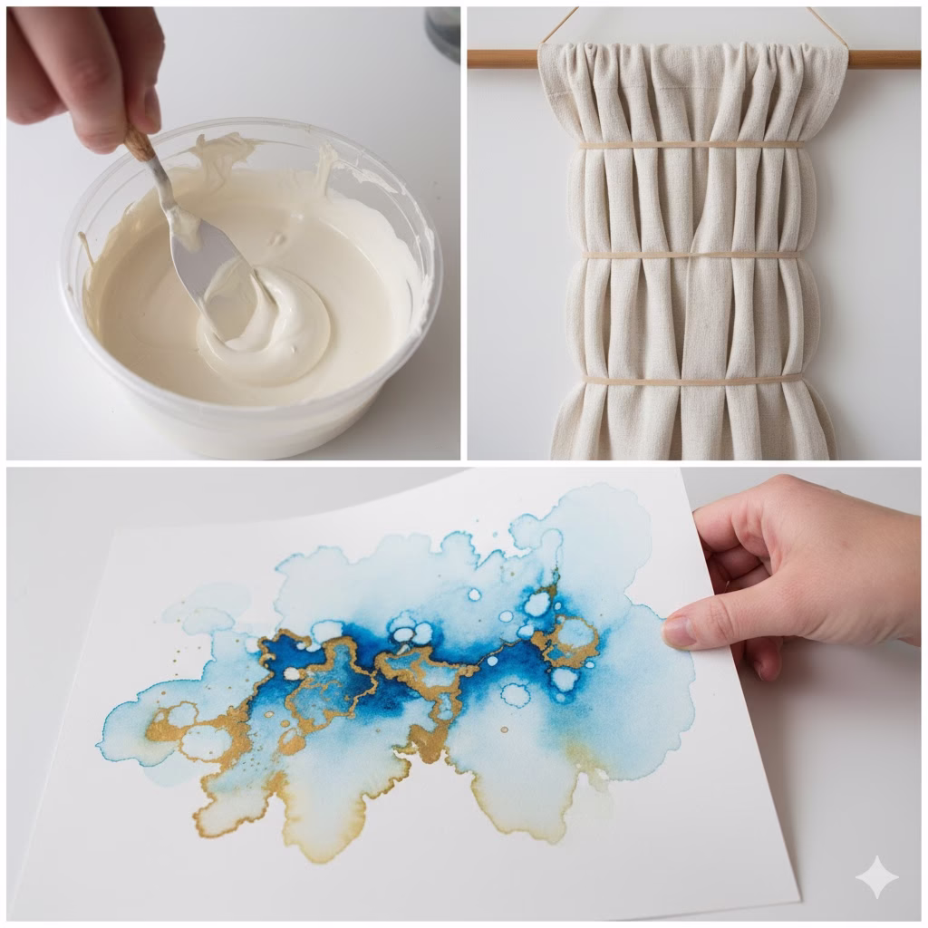 - Liquid Watercolor Ink or Acrylic Ink: Use highly pigmented liquid colors for the best “bleed” effect. Only use 2 to 3 colors that look good together (for example, Prussian Blue, Burnt Sienna, and Gold).