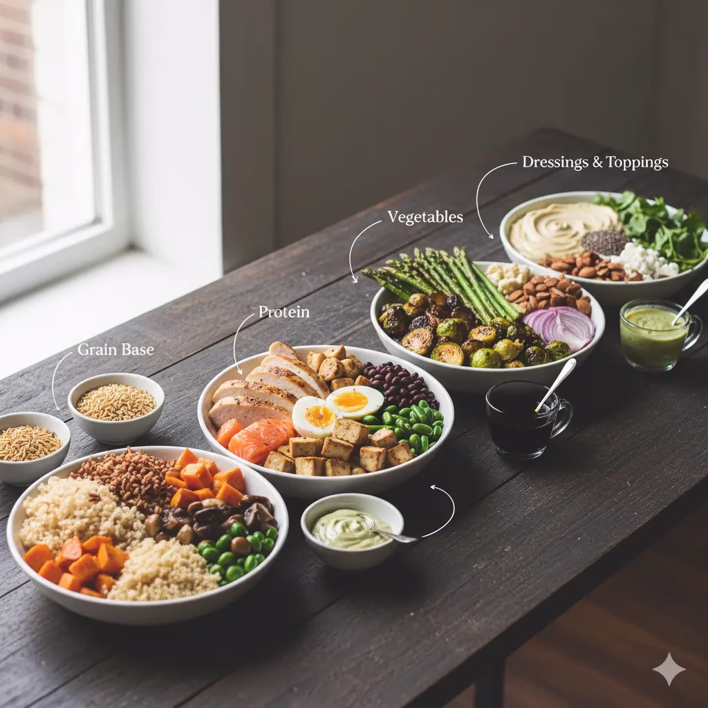 ProteinGrilled chicken, baked salmon, hard-boiled eggs, tofu, tempeh, black beans, edamame, or lentils for different protein sources.