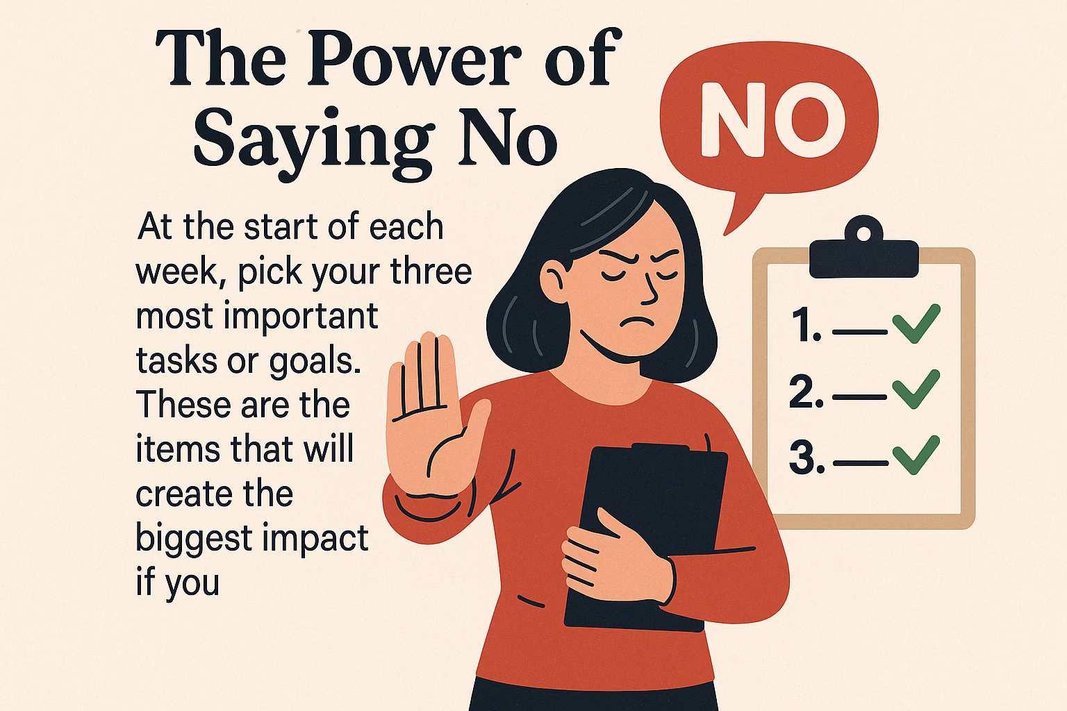 • Practice Saying “No”: Politely decline requests that don’t fit your goals or your capacity. Remember this: every “yes” to something is a “no” to something else. That “no” is often to your own well-being or most important work.