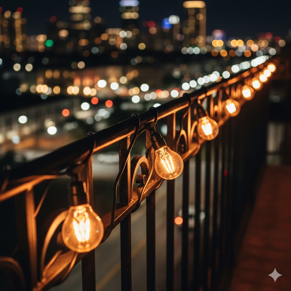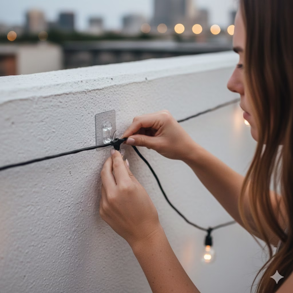 If your balcony is enclosed by glass, heavy-duty suction cups are great. They can hold light strands or small lanterns without any hardware. They are perfect for people who have glass railings or large windows overlooking their dreamy nighttime oasis.