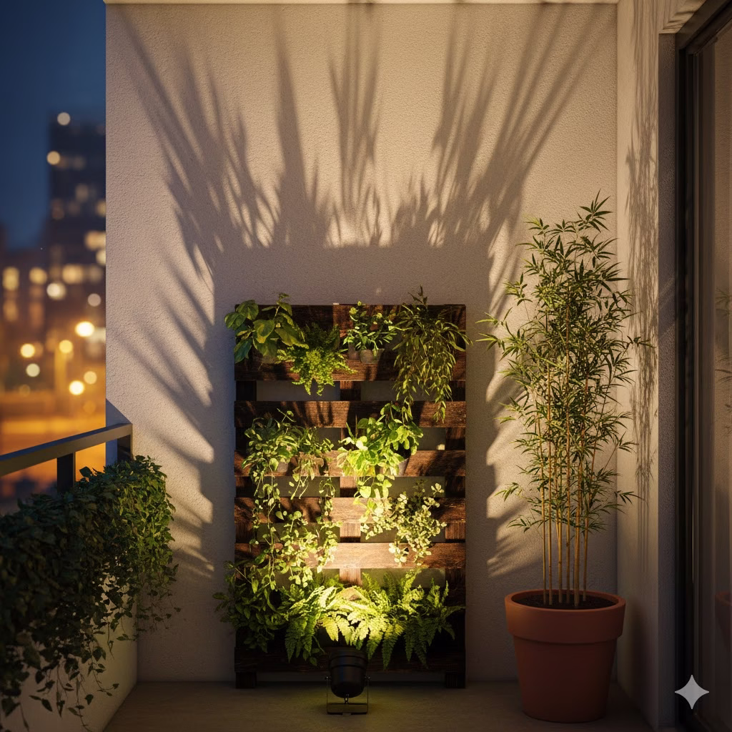 Lighting and plants go hand in hand. Use your lights to show off your vertical garden. Wrapping thin wire lights around the stems of sturdy plants makes them glow from within. It creates a lush, jungle-like feeling even in the middle of a busy city. This combination is the key to a truly dreamy nighttime oasis.