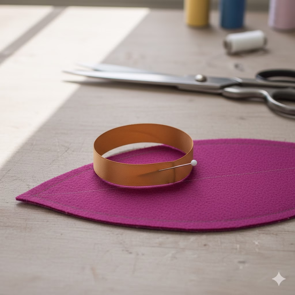 - Ribbon Loops: Decide where you want the ribbon loops and other things (like teething rings). Put the cut ribbons into the seam allowance on the curved edge of three or four panels. Make sure the cut ends line up with the edge and the loop points inward. Pin them firmly in place.