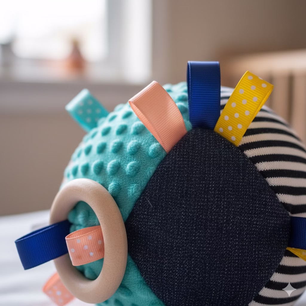 | Accessories | Textured ribbon loops (satin, grosgrain), small teething ring, large wooden beads sewn securely to a loop. | Grasping, Mouth Exploration (if safe), and extra Touch excitement. |