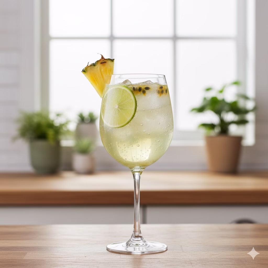 - Mix the chilled green tea, pineapple juice, lime juice, passion fruit purée, and sweetener (if using) in a cocktail shaker. Fill it with ice.