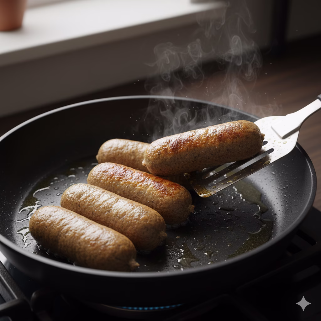 - Fry Sausages: Carefully put the cooked soya sausages into the hot pan.