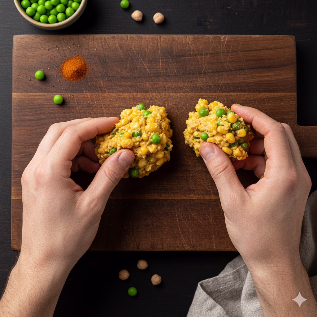 Prepare the Base: In a food processor, combine the drained chickpeas, sweetcorn, and green peas. Pulse a few times to roughly chop the ingredients. Be careful not to over-process them into a paste. The goal is to keep some texture and individual pieces of sweetcorn and peas visible, which will give the drops their “chunky” and rustic appearance.