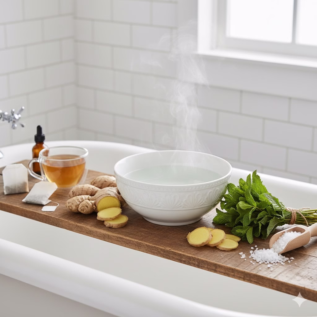 Image Placement: A close-up of feet soaking in the prepared bath, with visible steam and floating ingredients (ginger and mint leaves).