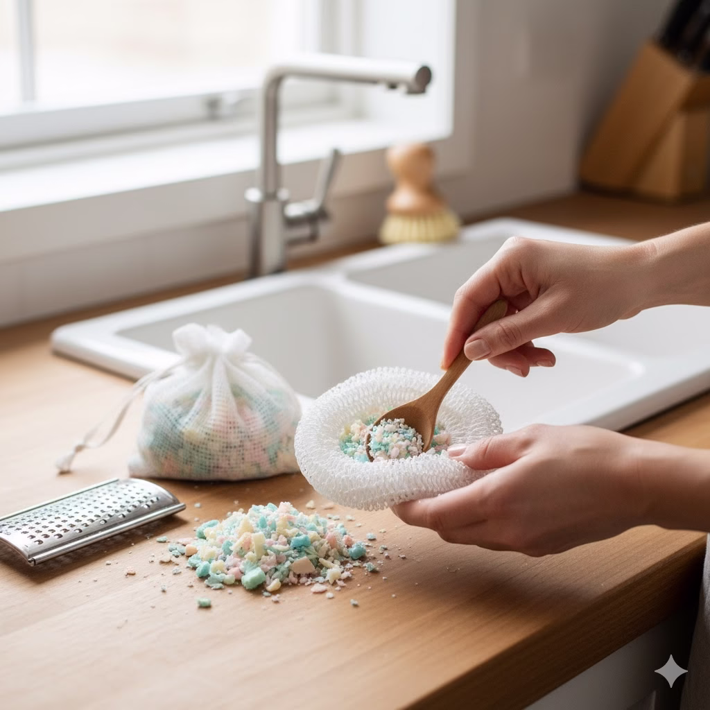 - Find a Pouch: Use a reusable mesh scouring pad, a small nylon scrub pad, or even a piece of old pantyhose cut and tied into a small pouch.