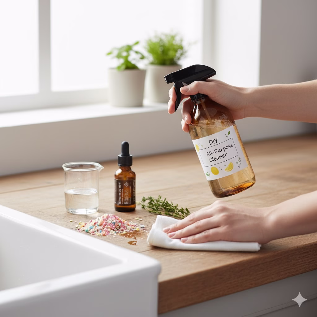 Make a non-toxic spray that is safe for cleaning counters and sinks. This cleaner cuts through light dirt and grease.