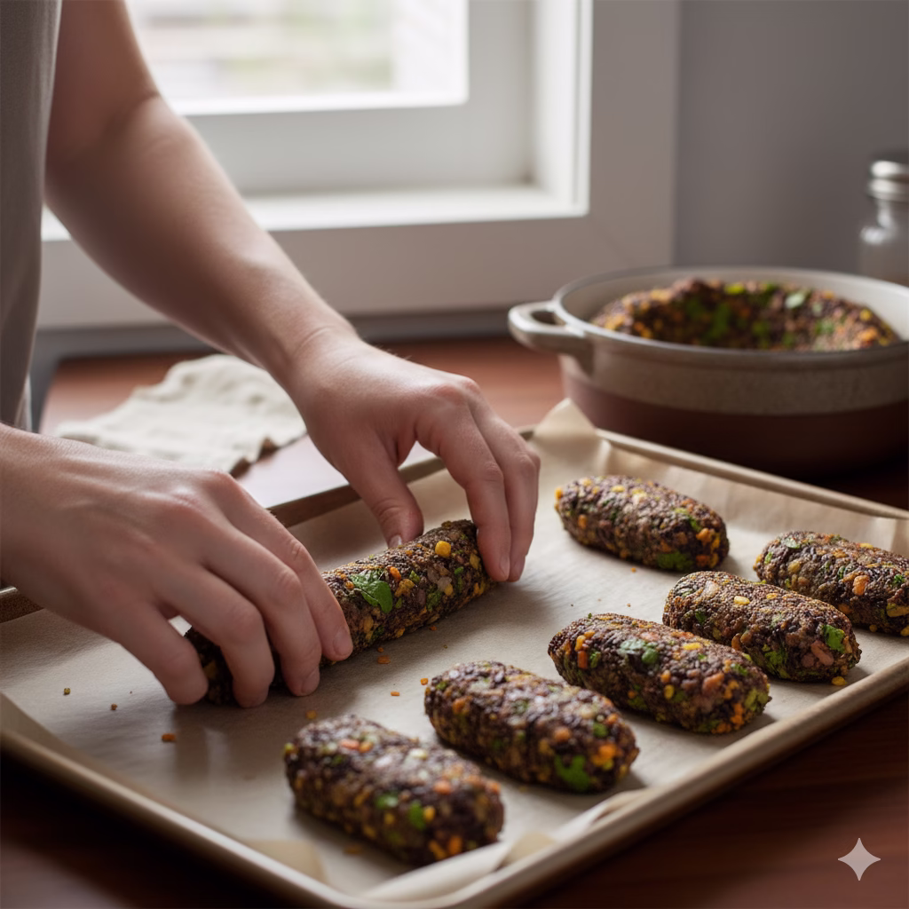 Shape the Patties: Take about 2-3 tablespoons of the mixture. Roll it into a sausage-like shape, about 3-4 inches long and 1 inch thick. Put the shaped patties on a baking sheet lined with parchment paper. Do this with the rest of the mixture. You should get about 12-14 patties.