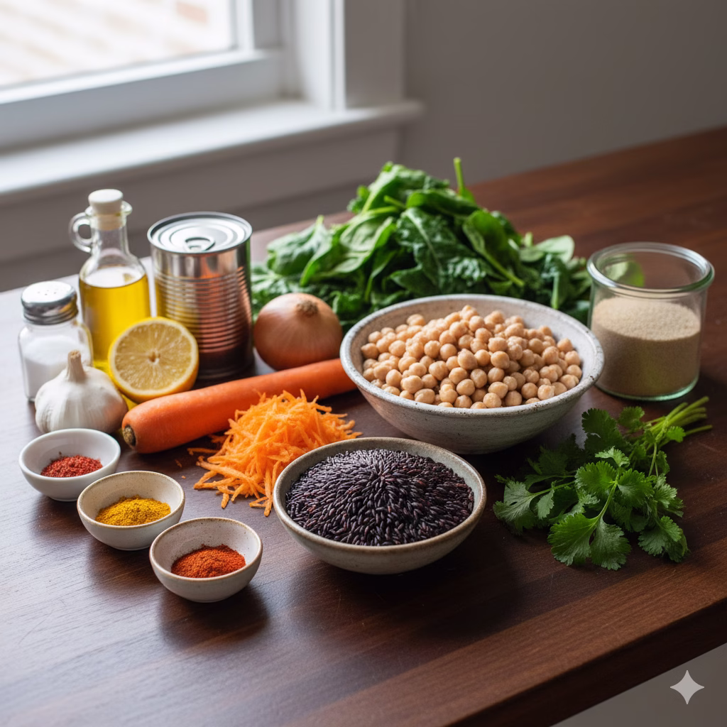 Both black rice and chickpeas are full of fiber. Fiber is important for good digestion. It helps keep you regular and supports a healthy gut. It also helps you feel full, which can help with weight management.