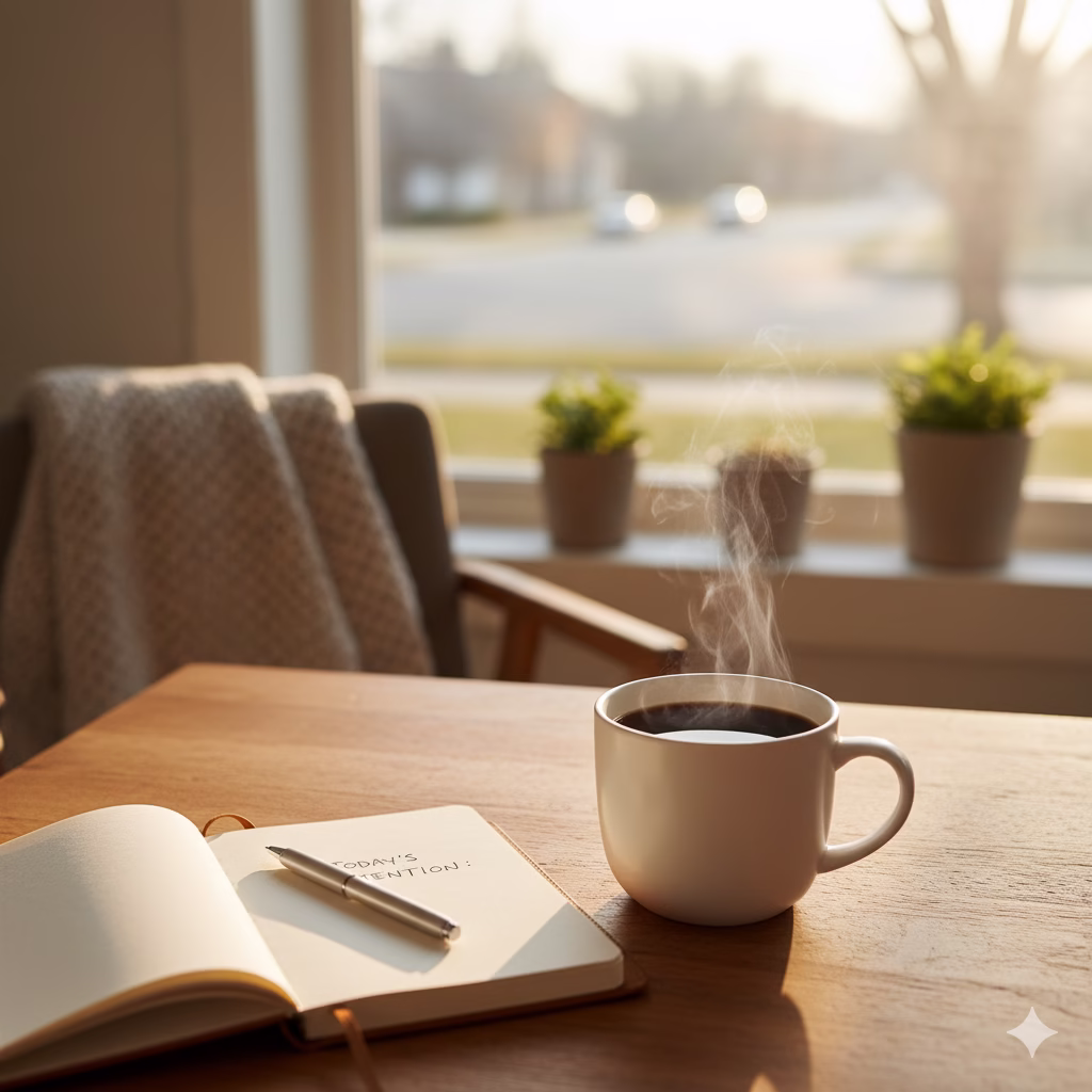 A calm, sunlit scene showing a mug of steaming coffee next to an open journal, representing a successful morning routine powered by Motivational Quotes and intention.