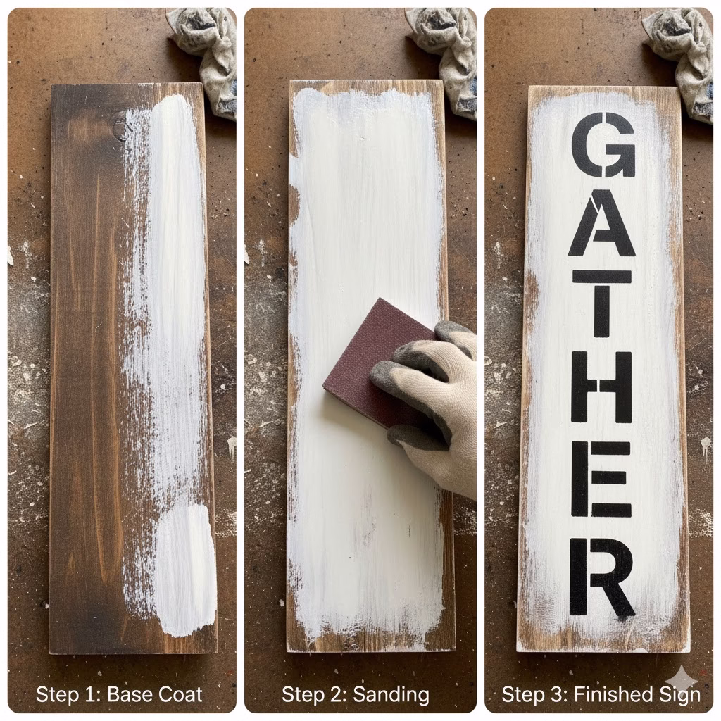- Distressing: Once dry, use a light sanding block over the letters and edges for that essential worn, rustic appearance.