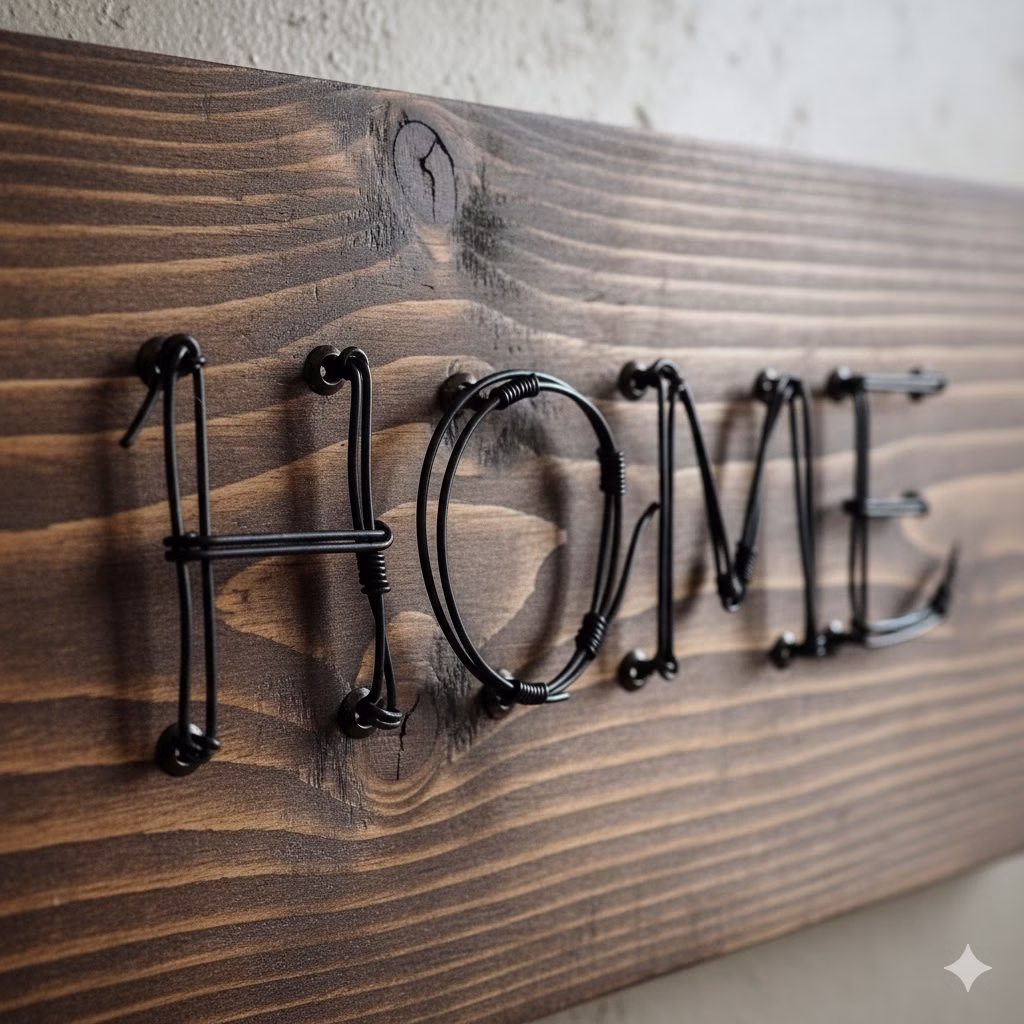 - Design: Lightly sketch your word (e.g., “Home”) onto the wood. Drill small pilot holes and insert the eyelet screws along the line of the text.