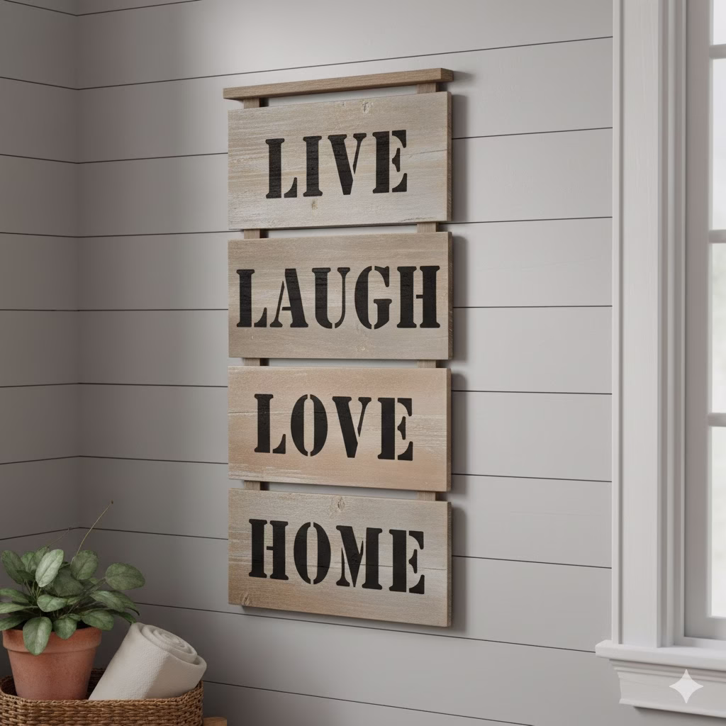 - Text: Apply a vertical phrase, with one word on each horizontal plank (e.g., “Live,” “Laugh,” “Love”). Simple stencils and bold fonts work best for this kind of Wall Décor piece.