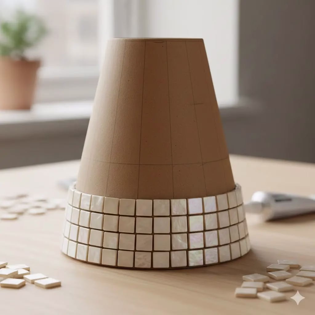 • The Tiling Material: You need small square mosaic tiles. For the look in the picture, choose tiles that are very small (about one-quarter inch or less) and have a shimmering, iridescent, cream, or light gold finish. You can use glass, thin mother-of-pearl pieces cut into squares, or even high-quality plastic resin tiles. The number of tiles you need depends on the size of your cone.