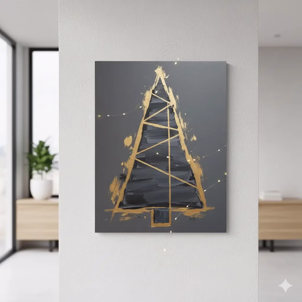 - Tape the Shape: Use painter’s tape to mark out the shape of your tree directly on the canvas. Instead of a traditional triangle, consider a modern geometric design—three overlapping triangles, or a single thick, stylized geometric cone.
