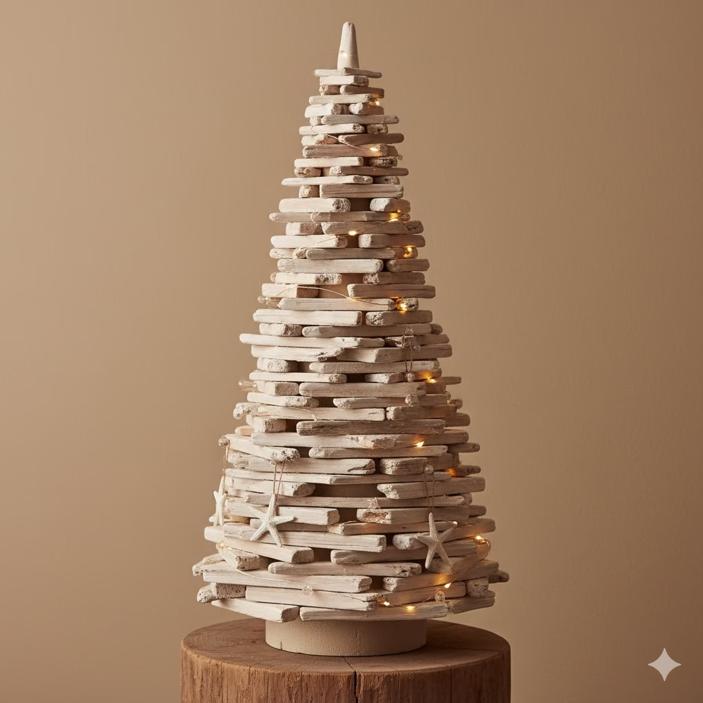 Concept: A coastal-meets-Scandinavian look. This tree uses natural, weathered elements arranged in a classic conical shape, lending an organic, textured feel.