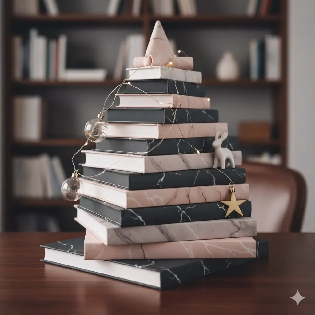 - Decorate: The spine of each book serves as a perfect ledge for small, curated ornaments or a delicate garland of pearls. The “tree” instantly looks refined and tailored.