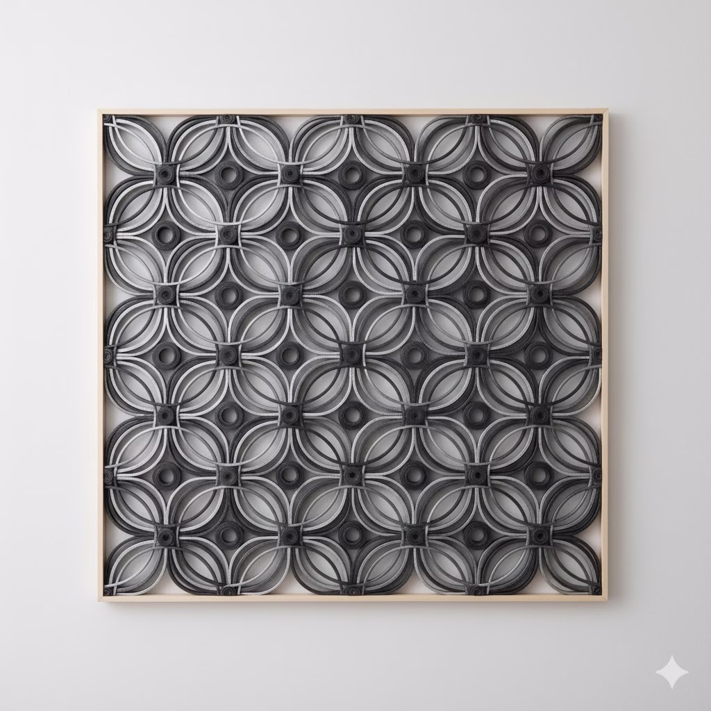 - Assembly: Glue the rings onto a prepared canvas, arranging them in a repeating geometric pattern, overlapping some for a layered effect.