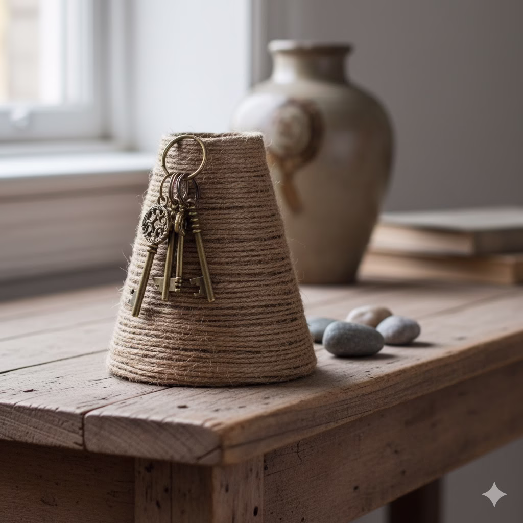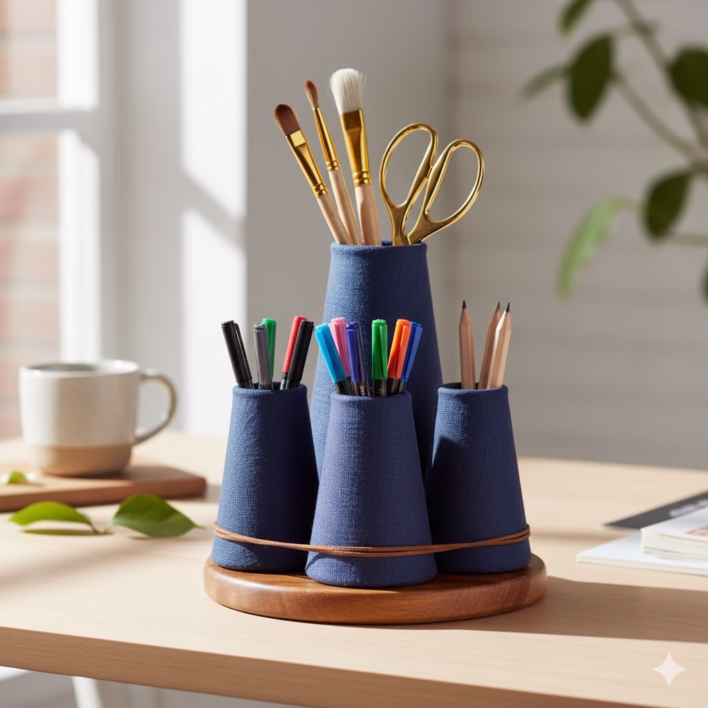 The structural integrity of a yarn cone makes it an excellent base for a desktop organizer.