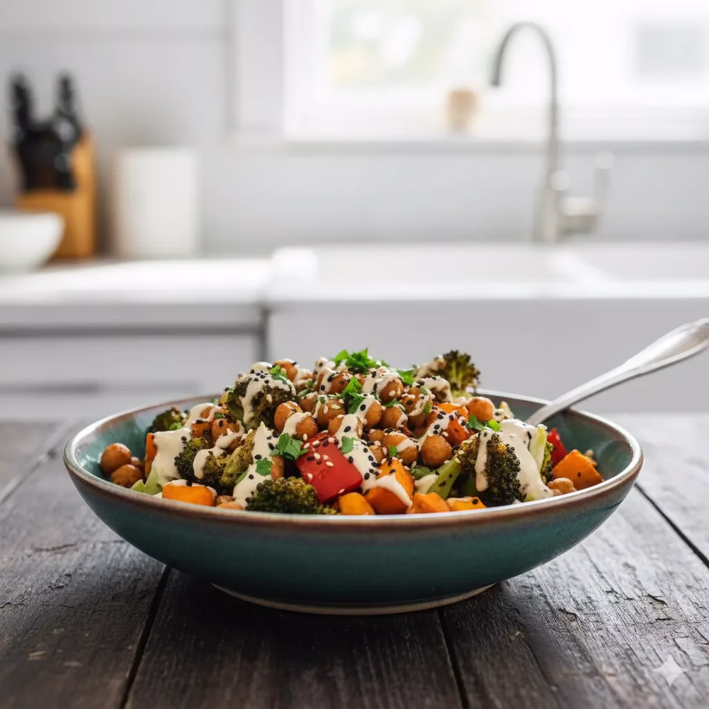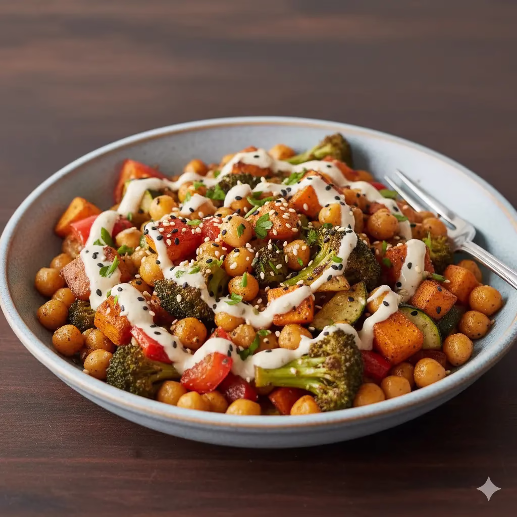 Assemble and Serve: Once the vegetables and chickpeas are perfectly roasted, remove them from the oven. You can serve this bowl warm over a bed of cooked quinoa or brown rice for a more substantial meal, or enjoy it as a standalone warm salad. Drizzle generously with the creamy tahini-lemon dressing. Garnish with fresh chopped parsley or cilantro and a sprinkle of sesame seeds, if desired.