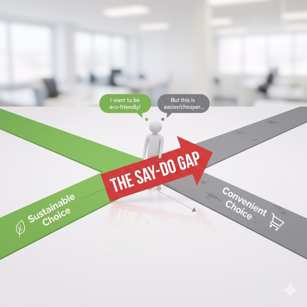 Many customers say they want to buy green products. This is good. But when they stand at the store shelf, they often buy the cheaper item. This gap between what people say and what they do is called the “say-do gap.” It is a big problem for new eco-businesses.