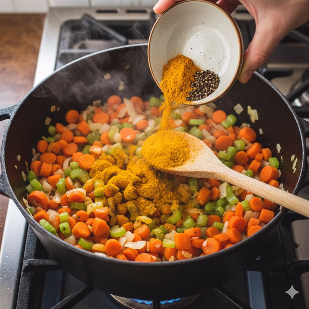 - Activate the Powers (Turmeric & Aromatics): Add the minced garlic and grated ginger. Cook for 1 minute until they smell fragrant. Now, add the ground turmeric and black pepper. This step is crucial. Stir quickly for about 30 seconds. The heat and fat (oil) will help wake up the curcumin in the turmeric.